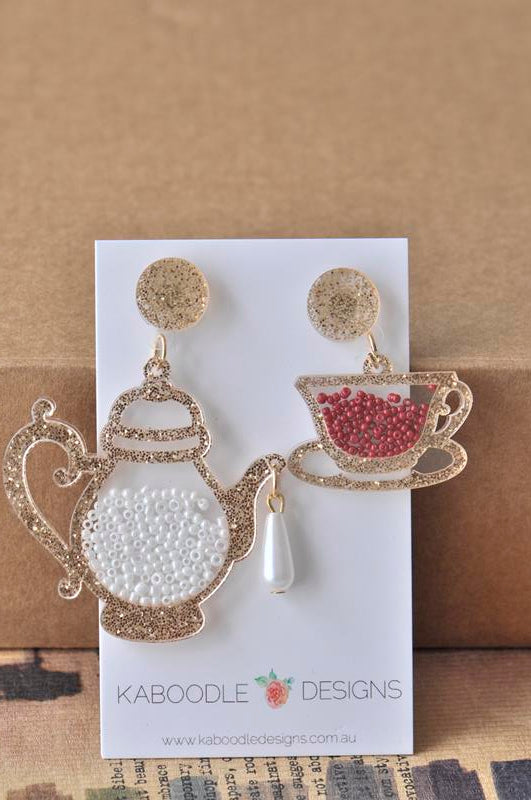 Acrylic Perspex Laser Cut Tea Pot and Tea Cup Drop Earrings - Gold