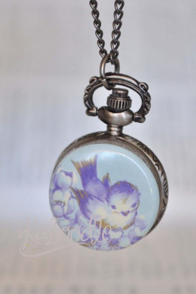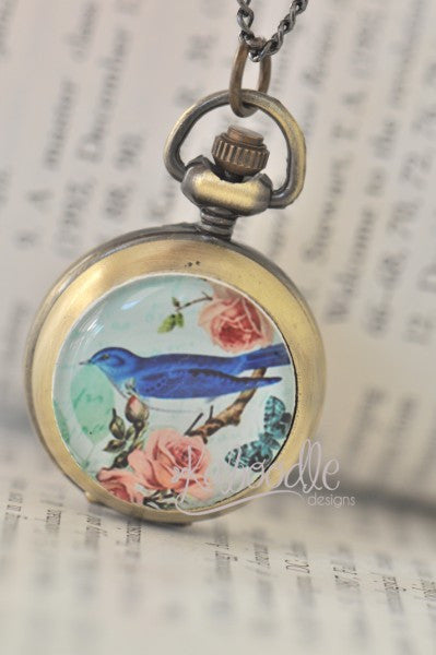 Blue Bird with Roses - Pocket Watch Necklace