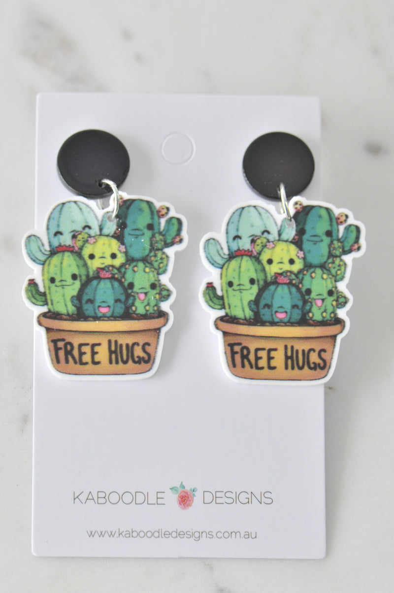 Acrylic Cactus Free Hugs Inspirational Drop Dangle Earrings