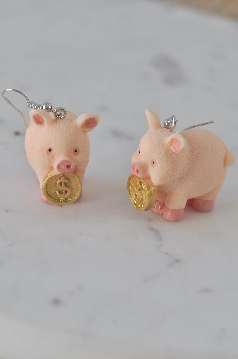 Novelty Piggy Bank Pig With Gold Coin Drop Dangle Earrings
