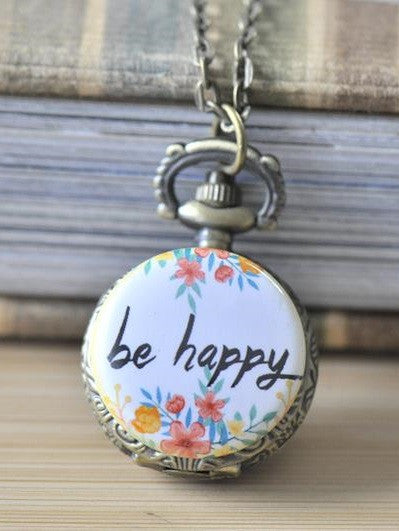 Handmade Artwork Stainless Steel Pocket Watch Necklace - Flower Wreath BE HAPPY