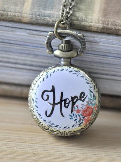 Handmade Artwork Stainless Steel Pocket Watch Necklace - Flower Wreath HOPE