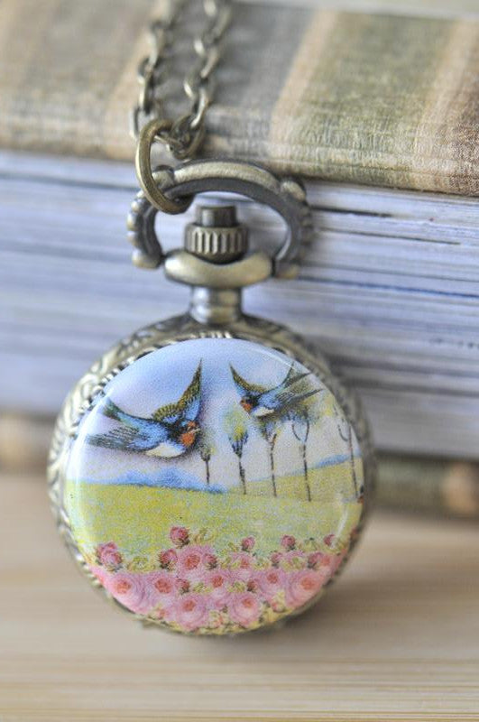 Handmade Artwork Stainless Steel Pocket Watch Necklace - Vintage Birds over Rose Field