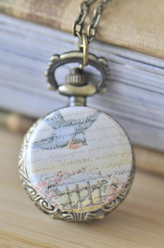 Handmade Artwork Stainless Steel Pocket Watch Necklace - Vintage Bird Script