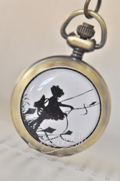 Handmade Artwork Stainless Steel Pocket Watch Necklace - Silhouette Girl Flying a Kite